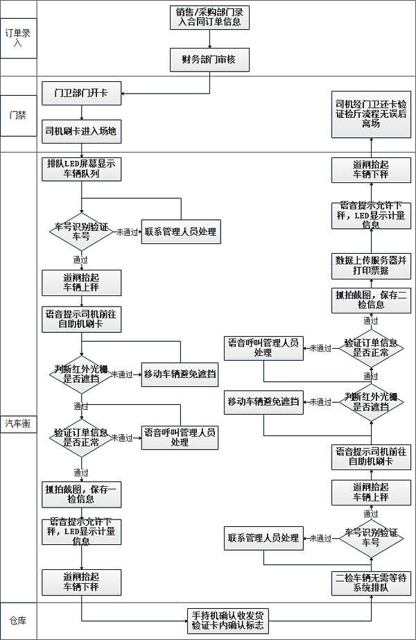 按功能性劃分,主要由以下幾個小系統(tǒng)組成:合同管理系統(tǒng)(包括采購合同,銷售合同,運(yùn)費(fèi)合同等),門禁系統(tǒng),排隊系統(tǒng),無人值守稱重系統(tǒng),倉庫存儲系統(tǒng),PDA手持終端收發(fā)貨管理,財務(wù)管理系統(tǒng),結(jié)算系統(tǒng)等。