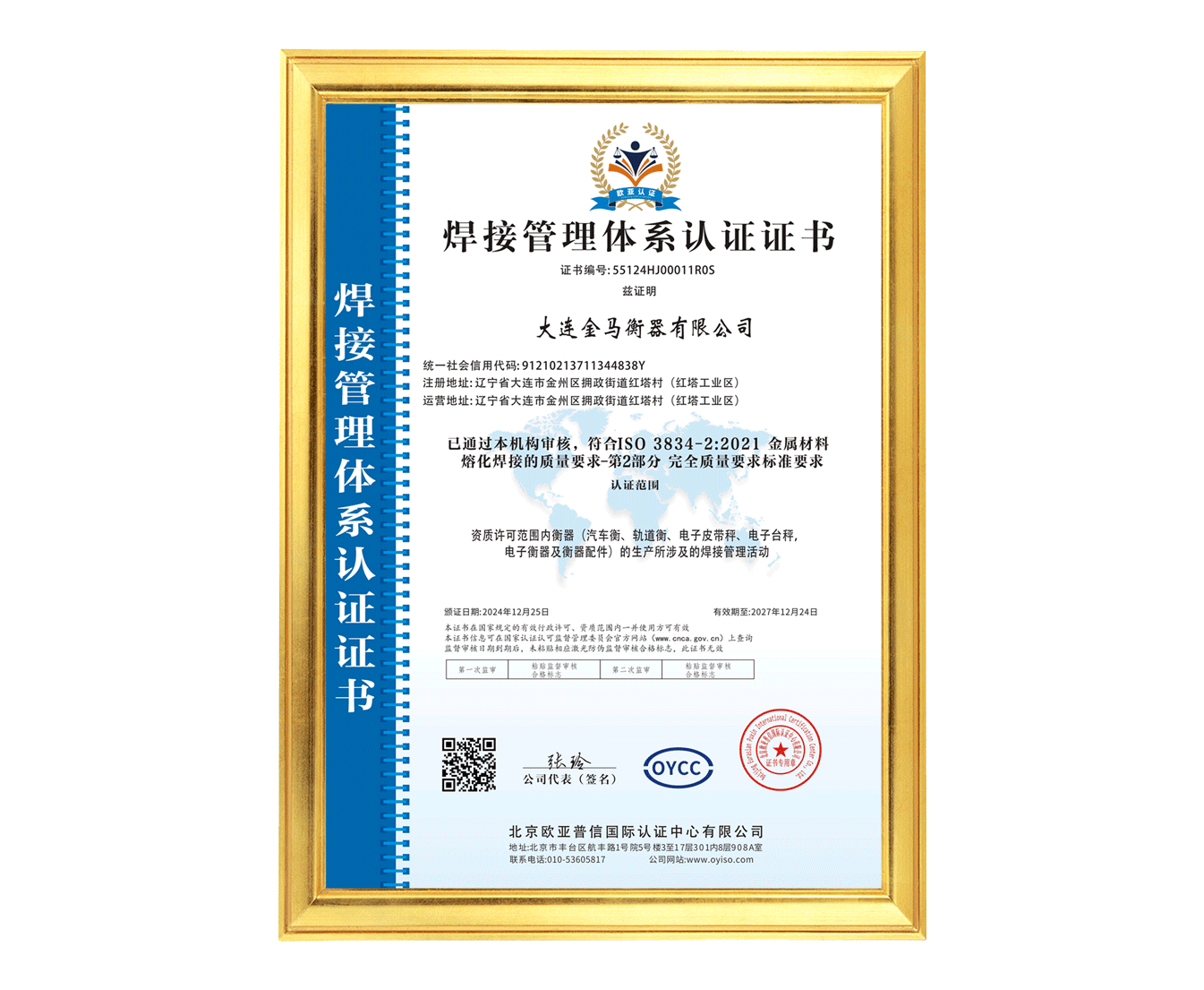 焊接管理體系認(rèn)證證書(shū)