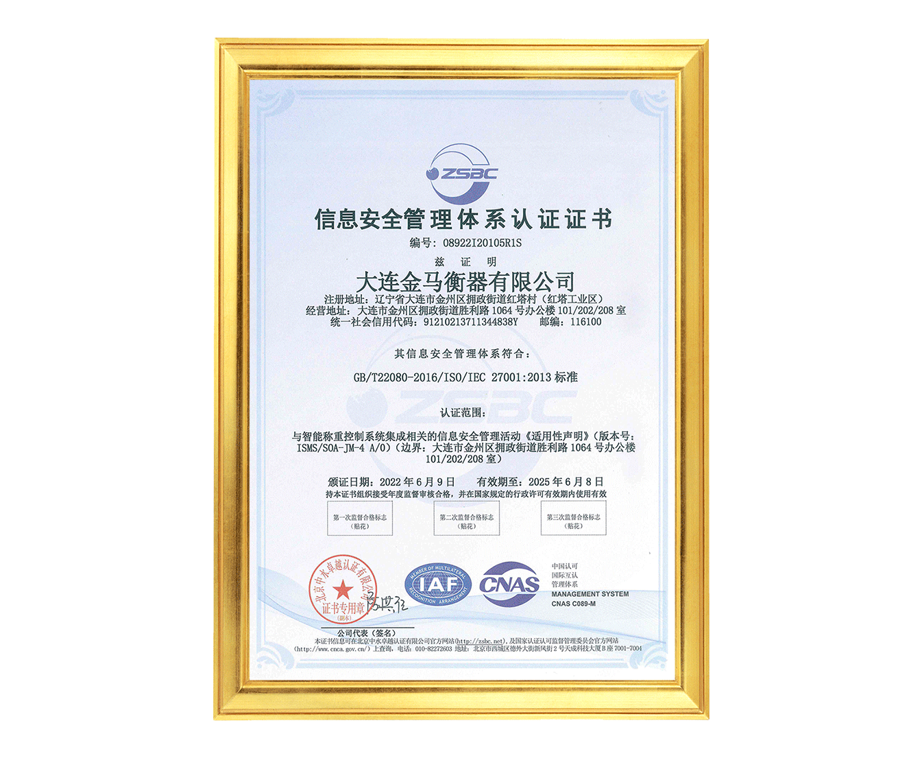 信息安全管理體系認(rèn)證證書(shū)